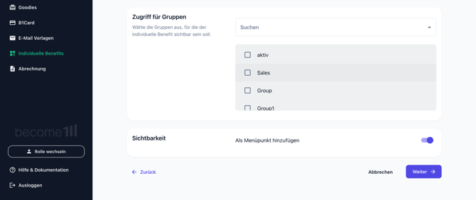 7. Entscheide unter Sichtbarkeit, ob der neue Benefit auch als Menüpunkt in der linken Menüleiste für die Arbeitnehmer aufgeführt werden soll