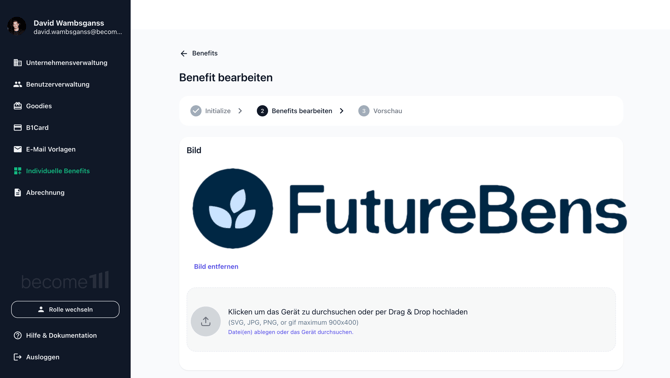 9. Wähle nun ein passendes Bild für den neuen Benefit aus und lade dieses über den Upload Bereich (Klicken um das Gerät zu durchsuchen oder per Drag & Drop hochladen) hoch